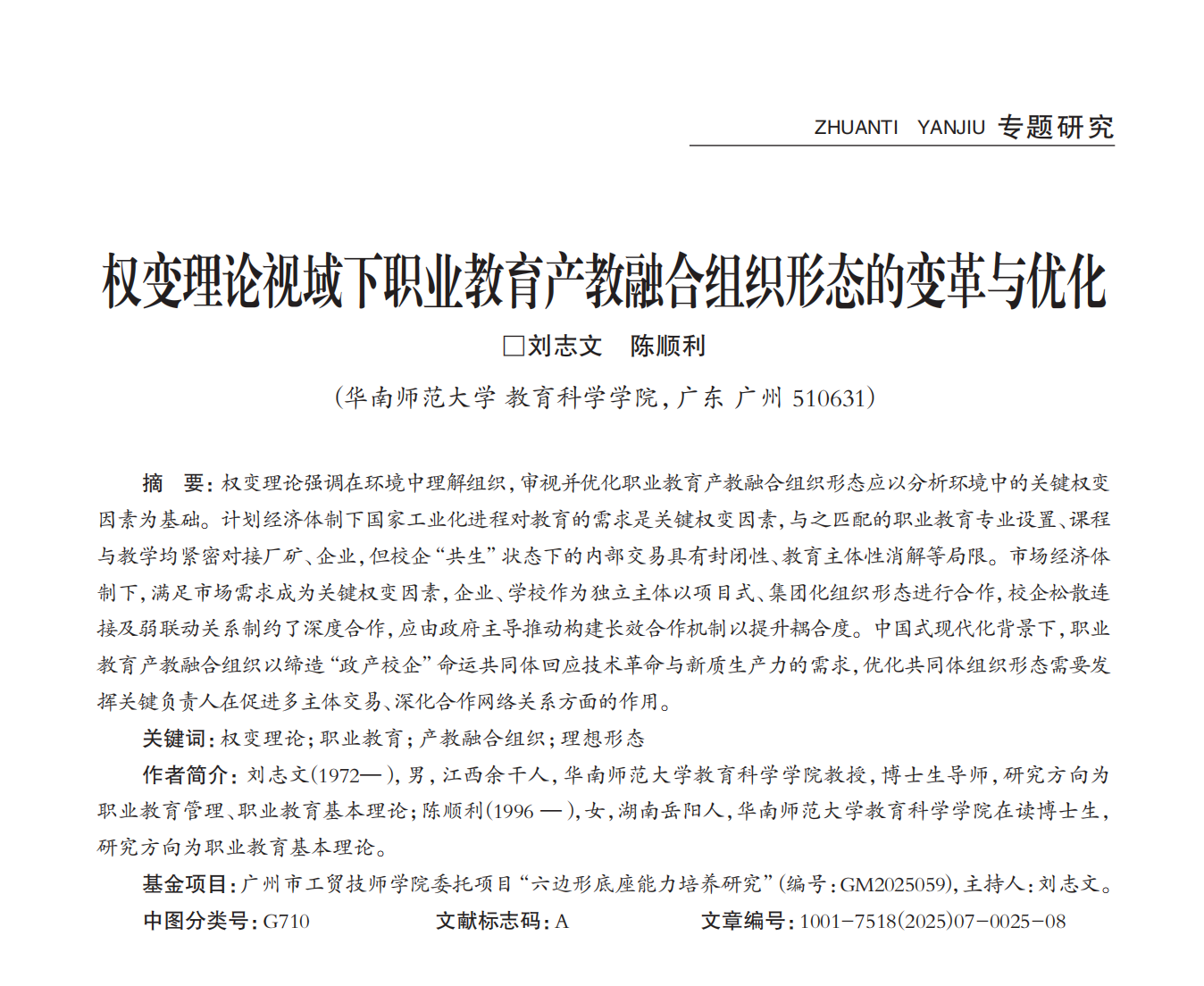 刘志文教授长期致力于职业教育管理与理论创新研究,主持多项国家级、省部级课题,成果丰硕。陈顺利同学作为在读博士生,积极参与科研工作,展现出良好的学术潜力。该成果的发表与摘编,是我院持续推进学科建设、提升科研质量的生动体现。