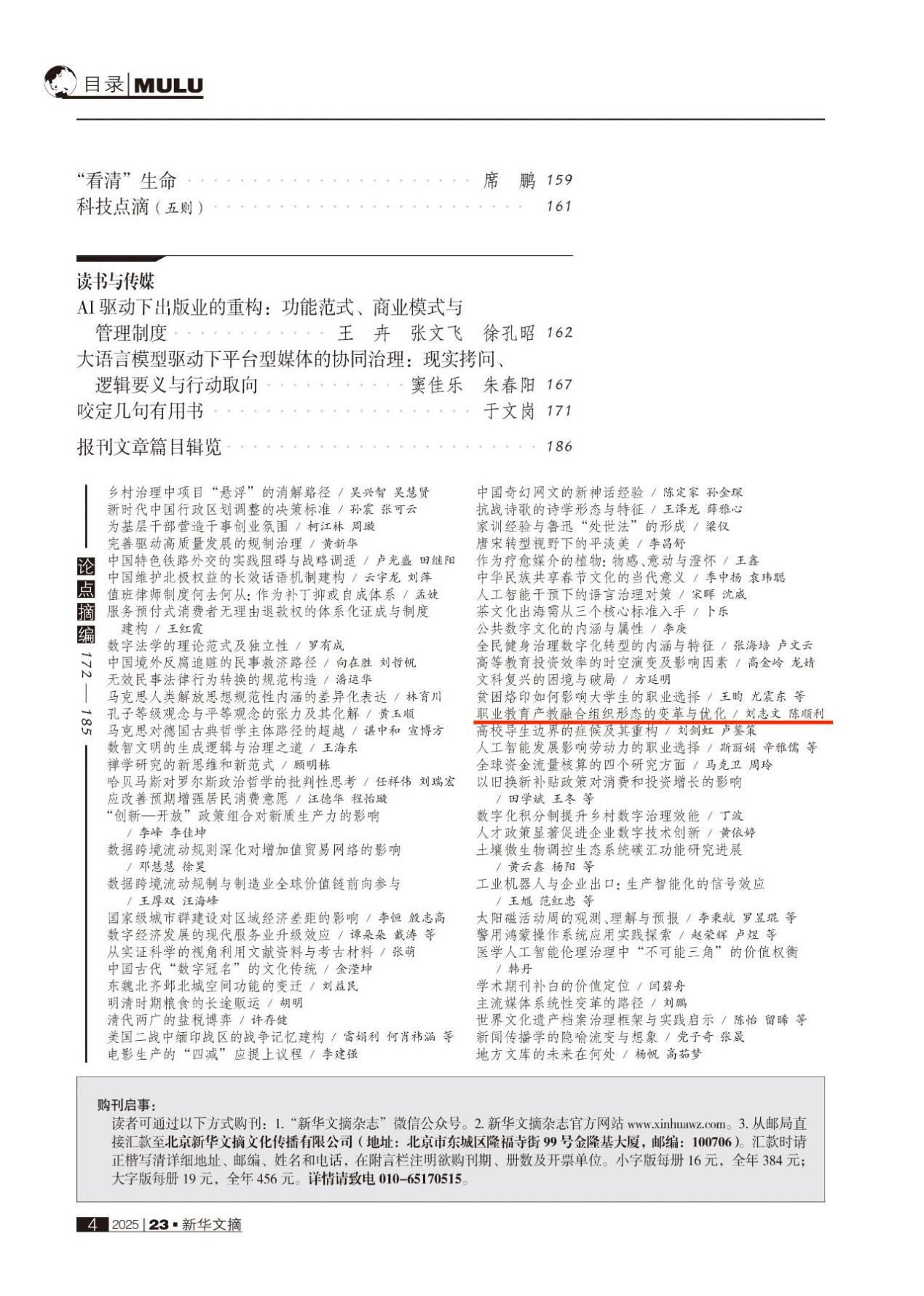 《新华文摘》作为国内权威的综合性文摘期刊,其“论点摘编”栏目旨在撷取人文社科领域具有思想性、前瞻性和影响力的学术观点。此次摘编不仅体现了该研究的学术价值与社会影响力,也彰显了我院在职业教育研究领域的深厚积累与创新活力。